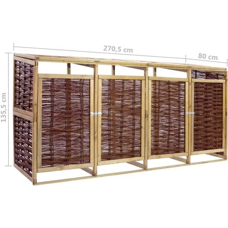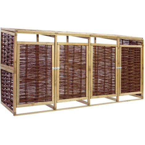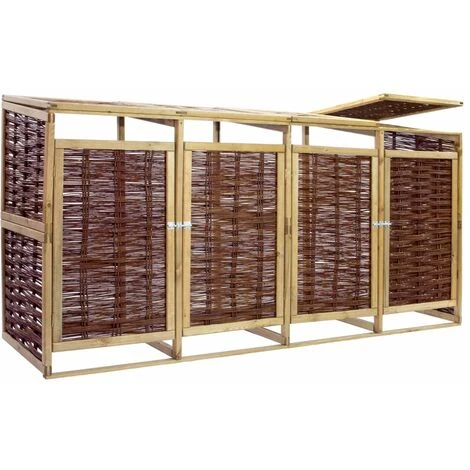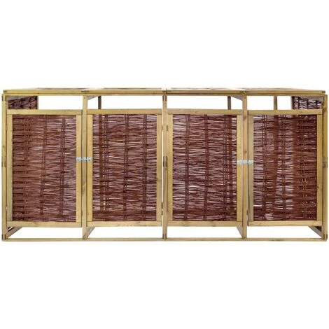 Cet abri en bois pour poubelles quadruple est idéal pour cacher vos poubelles des regards dans le jardin. L’abri de stockage a quatre portes à ouverture individuelle à l’avant qui permet aux poubelles d’être facilement enlevées et vidées. Il est équipé d’un verrou frontal pour maintenir la porte bien fermée. Cet abri de poubelle quadruple est fait de pinède et d’osier naturel, ce qui le rend non seulement résistant aux intempéries, durable, mais ajoute également un style rustique à votre espace de vie extérieur. Avec le matériel de montage inclus, le cache-poubelle est facile à assembler. Remarque : Les poubelles à roulettes ne sont pas incluses dans la livraison. Veuillez noter que le bois est un produit naturel pouvant présenter des imperfections.