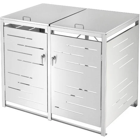 Ce box pour poubelle en acier inoxydable est une solution parfaite pour abriter vos poubelles des intempéries et de les envelopper discrètement. La porte et l’abattant sont fermants séparément. En outre, le revêtement offre une protection idéale à vos poubelles, afin qu’elles ne soient pas soumises aux intempéries.