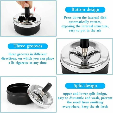 Facile à utiliser: le cendrier rotatif a une conception rotative à 360 degrés et est très pratique à utiliser. Vous pouvez verser la suie dans la chambre de collecte ci-dessous en appuyant sur le bouton en haut et en tournant le couvercle.
