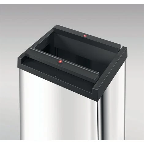 Inhalt 60 l · Deckel und Boden aus hochfestem schwarzem Kunststoff · Gehäuse aus pulverbeschichtetem Stahlblech · zweigeteilter Schwingdeckel schließt selbstständig, Verrastung zum kompletten Öffnen des Schwingdeckels möglich · mit Müllbeutel-Klemmrahmen · Boden mit 4 Anti-Rutsch-Füßen · Lieferung erfolgt zerlegt, einfache Montage