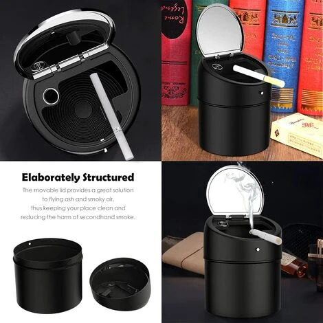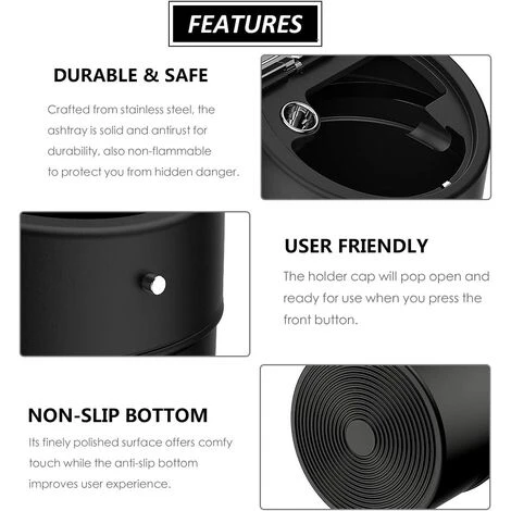 Convivial:La surface lisse de ce cendrier peut être facilement rafraîchie avec un chiffon humide.Si nécessaire, le cendrier est également amovible pour un nettoyage en profondeur.Et, le capuchon du support s’ouvrira et prêt à l’emploi lorsque vous appuyez sur le bouton avant.