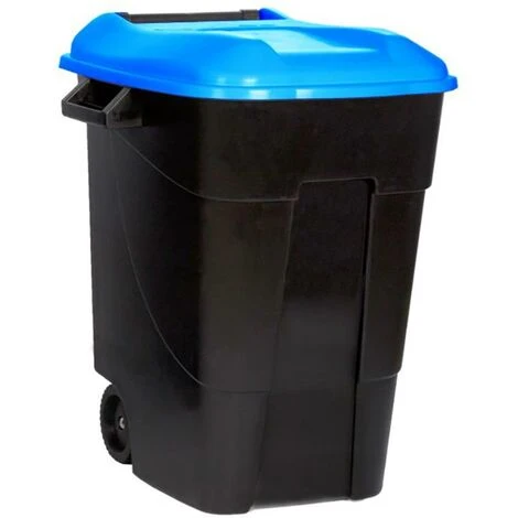 Capacité de 100 litres. Matériau PP. Avec roues. Couleur noire, couvercle bleu, roues noires. Avec des étiquettes d’utilisation. Emballage de 3 unités. L’emballage mesure 600x568x1070 mm.