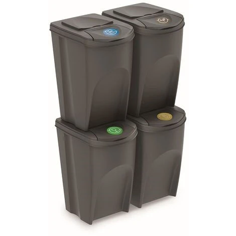 Lot de 4 bacs de recyclage de 35 litres de couleurs assorties pour papier, verre, plastique et organique.Le papier, le verre, le plastique ou le métal récolté, soigneusement séparé des déchets municipaux avec l’utilisation de solutions et d’accessoires modernes, devient une matière première précieuse.Une attitude consciente, respectueuse de l’environnement et économique n’a que des avantages : elle influe sur la limitation des décharges et l’utilisation rationnelle des ressources naturelles, en réduisant la pollution de l’air et de l’eau, en économisant de l’énergie et en réduisant les coûts. Il est également pratique et hygiénique pour une utilisation de l’espace de rangement qui est si précieux à la maison.Sortibox répond non seulement à ces exigences, mais fournit également des capacités de classification continue. Bien conçu, esthétique et spacieux (4 x 25 L), avec une structure spécialement conçue pour les espaces restreints, facilitant la disposition des segments en rangées ou poteaux stables.Capacité : 140 (35 x 4) litres. Dimensions : 39,2 x 29,3 x 45 cm (unité). Couleur : gris